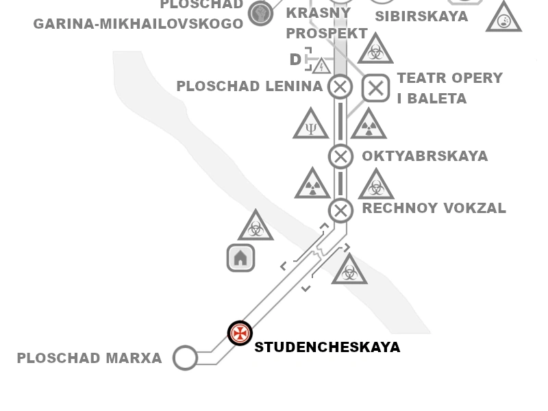 Da die Verbindung mit Studentscheskaja und Ploschtschad Marksa in den ersten Nachkriegstagen durch den Einsturz der Metro-Brücke, die beide Ufer der Stadt verband, verloren ging, wusste keiner der Bewohner der Stationen der Großen Metro von der Existenz mutierter Menschen sowie über das Leben am linken Ufer des Ob. Die Stalker der Fluss-Station, der Sibirischen Union und OSKOM machten nie eine Expedition über die zerstörte Metro-Brücke hinaus.