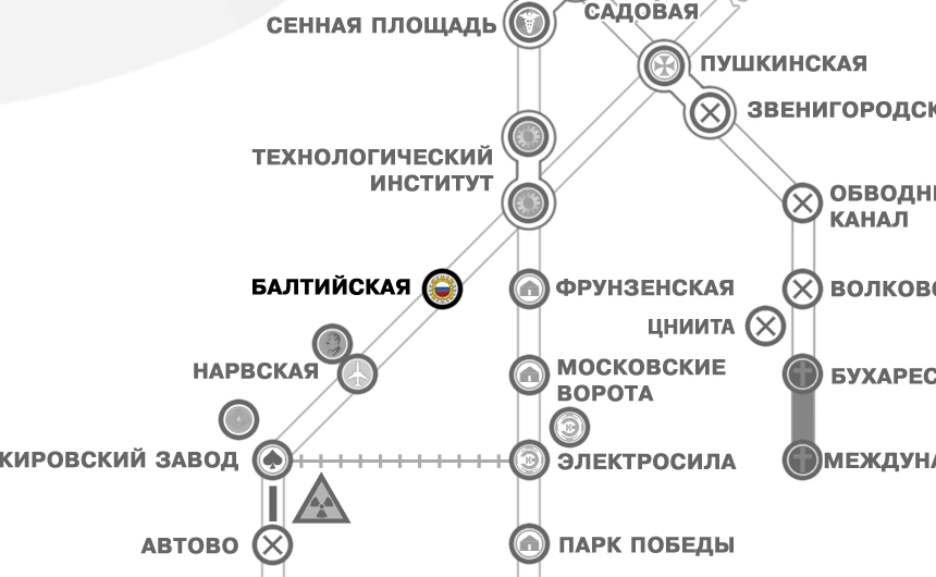 Станция Кировско-Выборгской линии. После случившейся Катастрофы власть на «Балтийской» взяли полицейские, находившиеся в этот момент на станции, а также спасшиеся сотрудники академии УВД Метрополитена. По этой причине основную часть населения составляют люди «в погонах», делающие вид, будто поддерживают порядок в метро.
