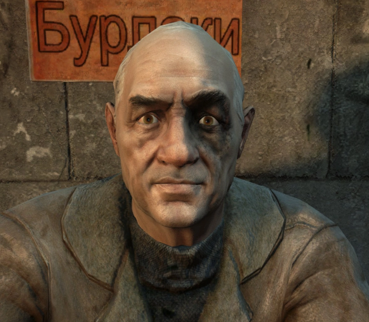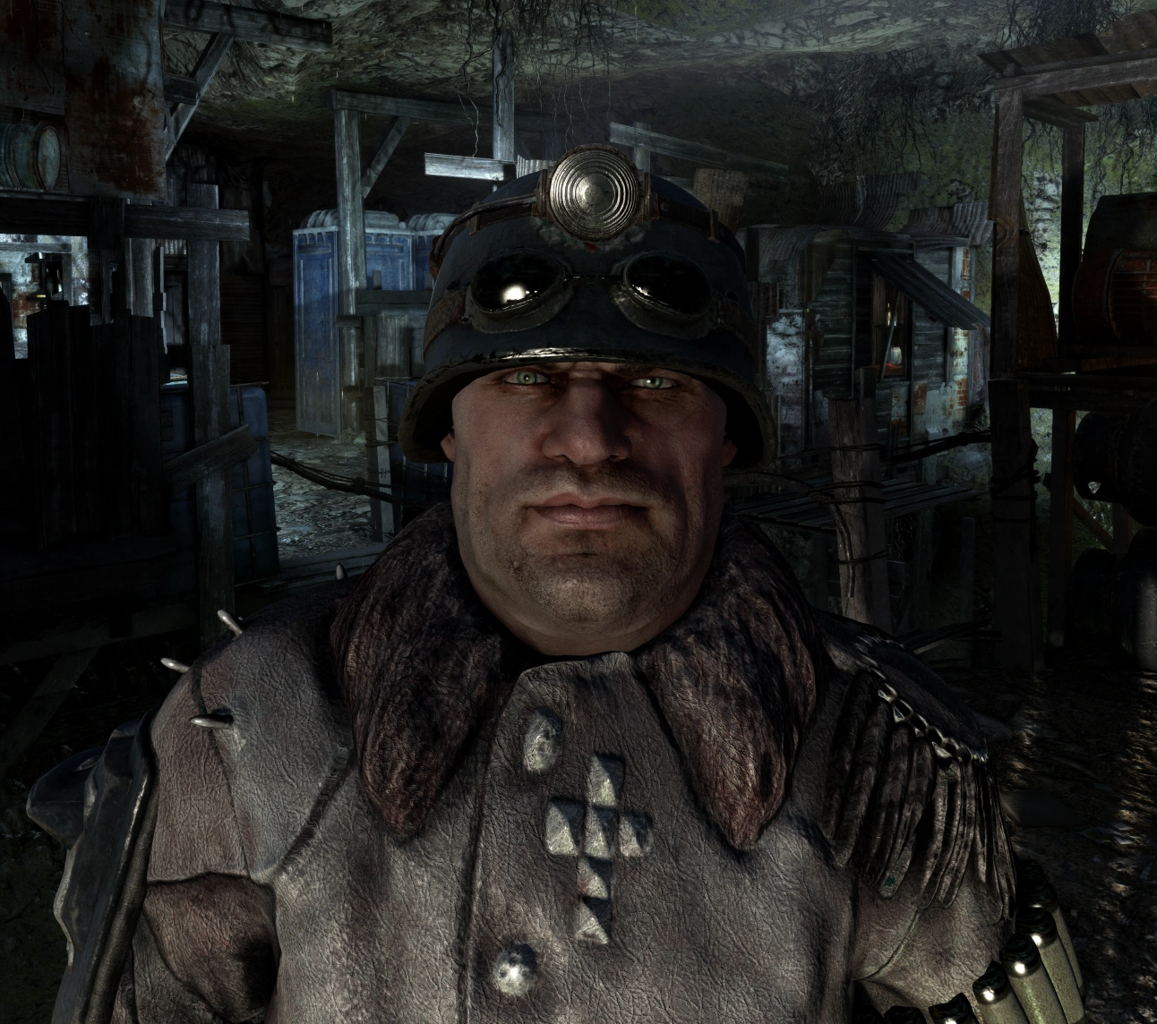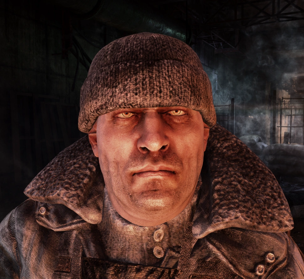 Бандит, носит кожаную куртку с нарисованным крестом и каску с пластиной Четвёртого Рейха. Живет в лагере под Новокузнецкой, по-соседству со рыбаком Щукарём. В мае 2034 года мужчина пытался безуспешно отговорить старика ловить рыбу в радиоактивной реке, и, получив поток ругательств в свой адрес, уходит к себе домой.