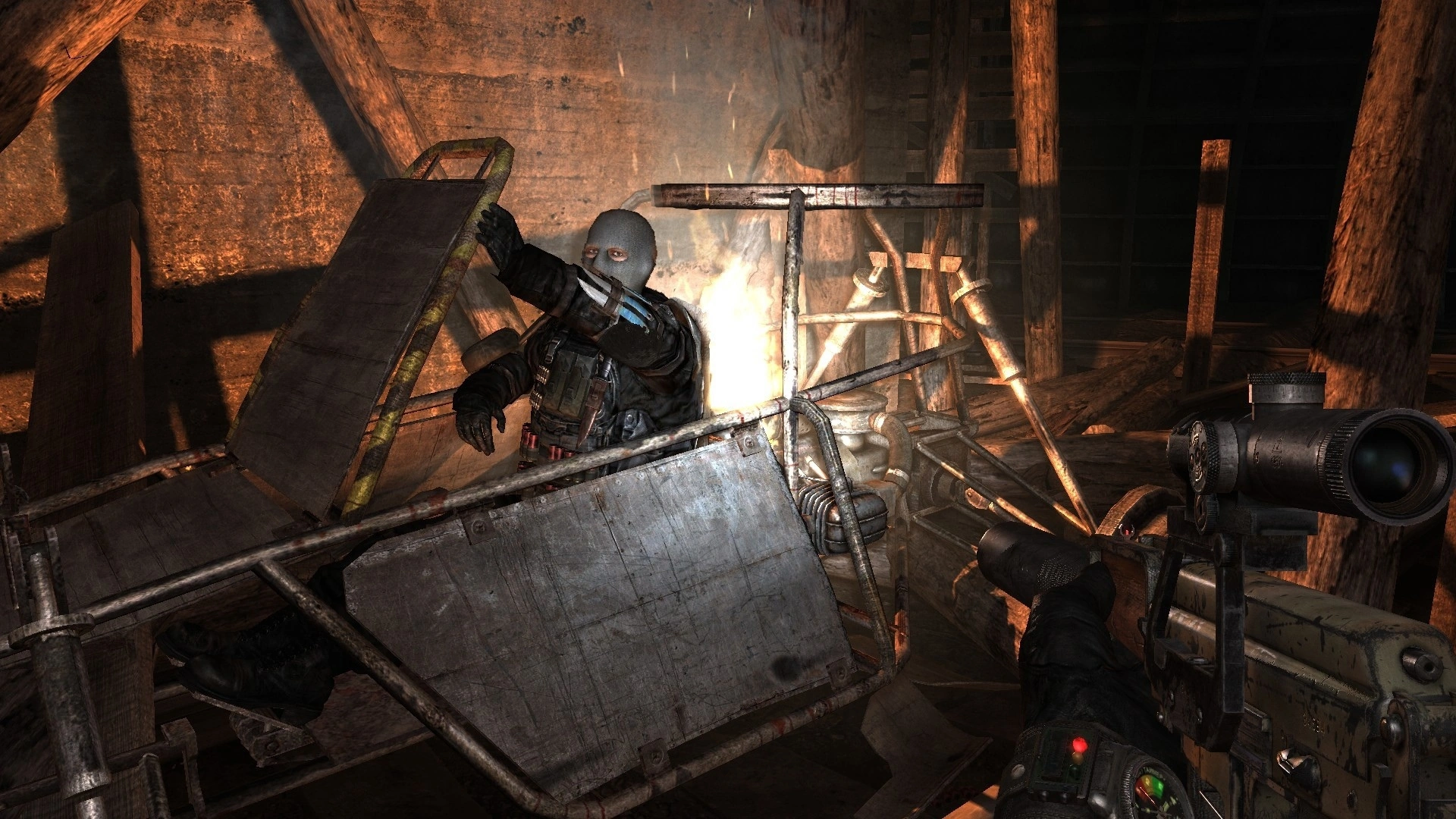 В оригинале деревянную баррикаду на пути дрезины нужно расстрелять из пулемёта, иначе дрезина дальше не поедет, а в Redux её с нескольких заходов должен пробить Павел, пока Артём сдерживает натиск фашистов.