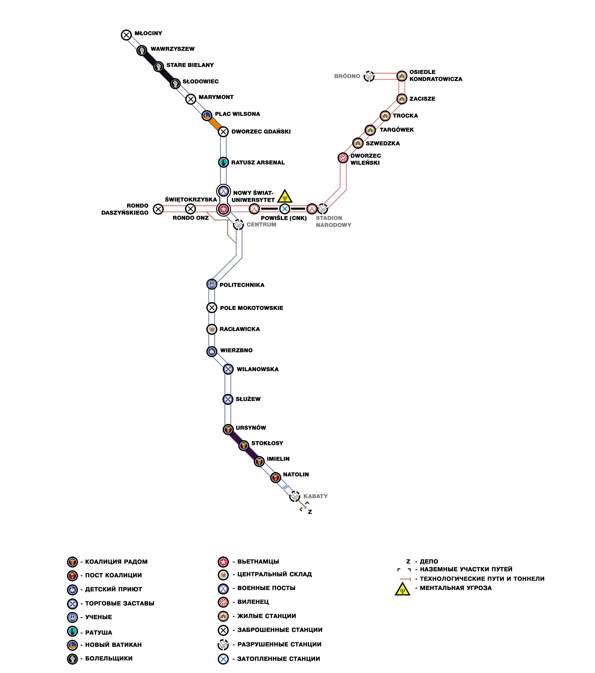 Над половиной Варшавского метро проходят зоны, в которых обитают мутанты. Эти территории помечены на схемах-путеводителях и обозначаются серым цветом. В самом метро практически нет опасных мест за исключением туннелей к «Привислой»: в перегоне к затопленной станции человек испытывает клаустрофобию и панический страх. Ввиду ментальной опасности и угрозы мутантов в туннелях на станции «Новый свет — Университет» стоит военный пост объединенных сил Ратуши и вьетнамцев.