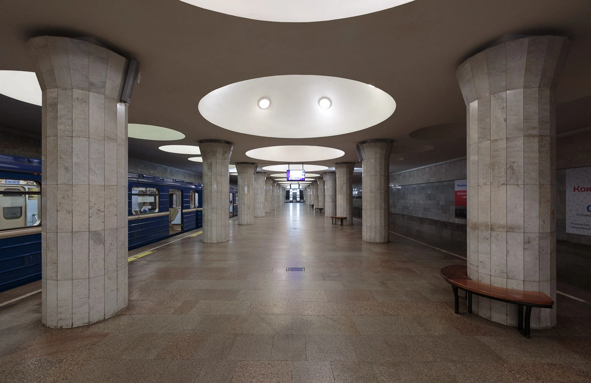 Оригинален потолок станции, выполненный из монолитного железобетона с полусферическими нишами, в которых расположены светильники. Путевые стены платформенного участка облицованы бледно-розовым мрамором, круглые колонны светло-серым мрамором. С одного вестибюля имеется эскалаторный спуск из трёх лент.