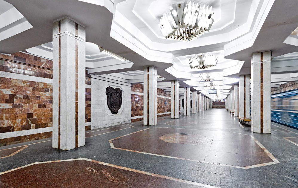 Колонная трёхпролётная станция мелкого заложения. Своей торжественной архитектурой она ещё раз подчеркивает свой статус столицы: четкий ритм прямоугольных колонн, пластичная структура потолка из крупноразмерных плит с восьмигранными кессонами и ритм светильников со светозащитными вертикальными ребрами. В проёмах между отполированными до блеска колоннами расположились торговые лавки с большим ассортиментом товара и жилые помещения.