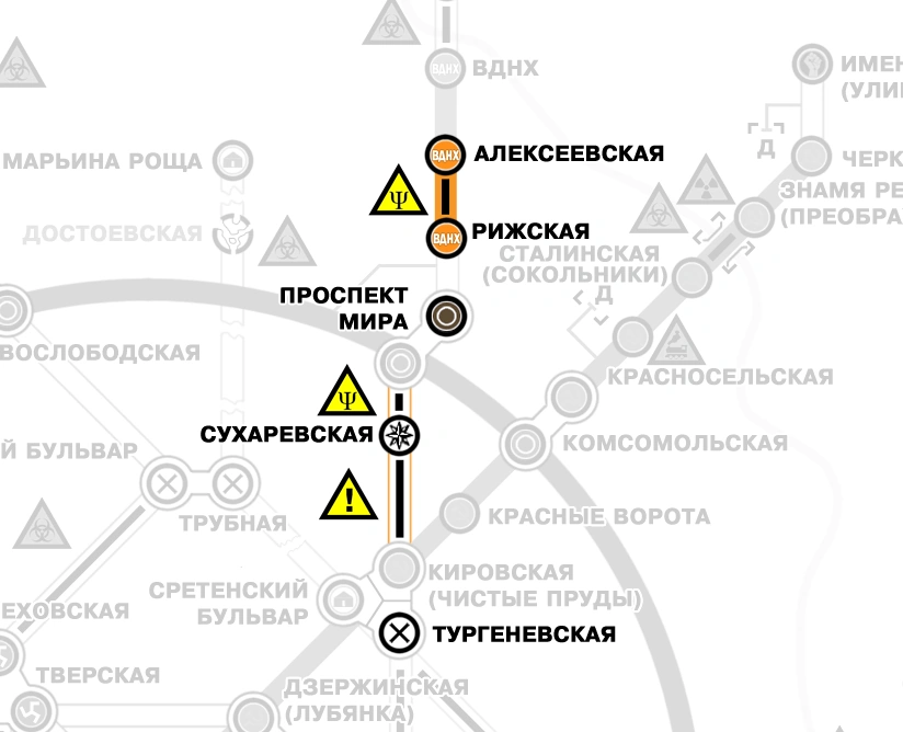 Московский метрополитен : ВДНХ (Тир ) • Рижская • Проспект Мира-радиальная • Сухаревская • Тургеневская (Храм Надежды ) • Кузнецкий Мост • Фронт • Станция Рейха • Павелецкая • Чёрная • Боровицкая • Арбатская (Зал Заседаний ) • Упоминаются: Севастопольская • Алексеевская • Третьяковская • Полежаевская • Октябрьское Поле • Беговая • Улица 1905 года • Белорусская • Новослободская • Китай-город • Проспект Мира-кольцевая • Лубянка • Спортивная • Киевская • Парк Победы • Мёртвый перегон Вырезанные : Алексеевская • Смоленская Метро-2 : Д-6 Москва : Королёвский • Останкинская телебашня • Форпост Рейха • Храм Христа Спасителя • Великая Библиотека • Кремль • Форпост Ордена • Ботанический сад • Улей Чёрных • Упоминаются: Курчатовский институт • Московская область