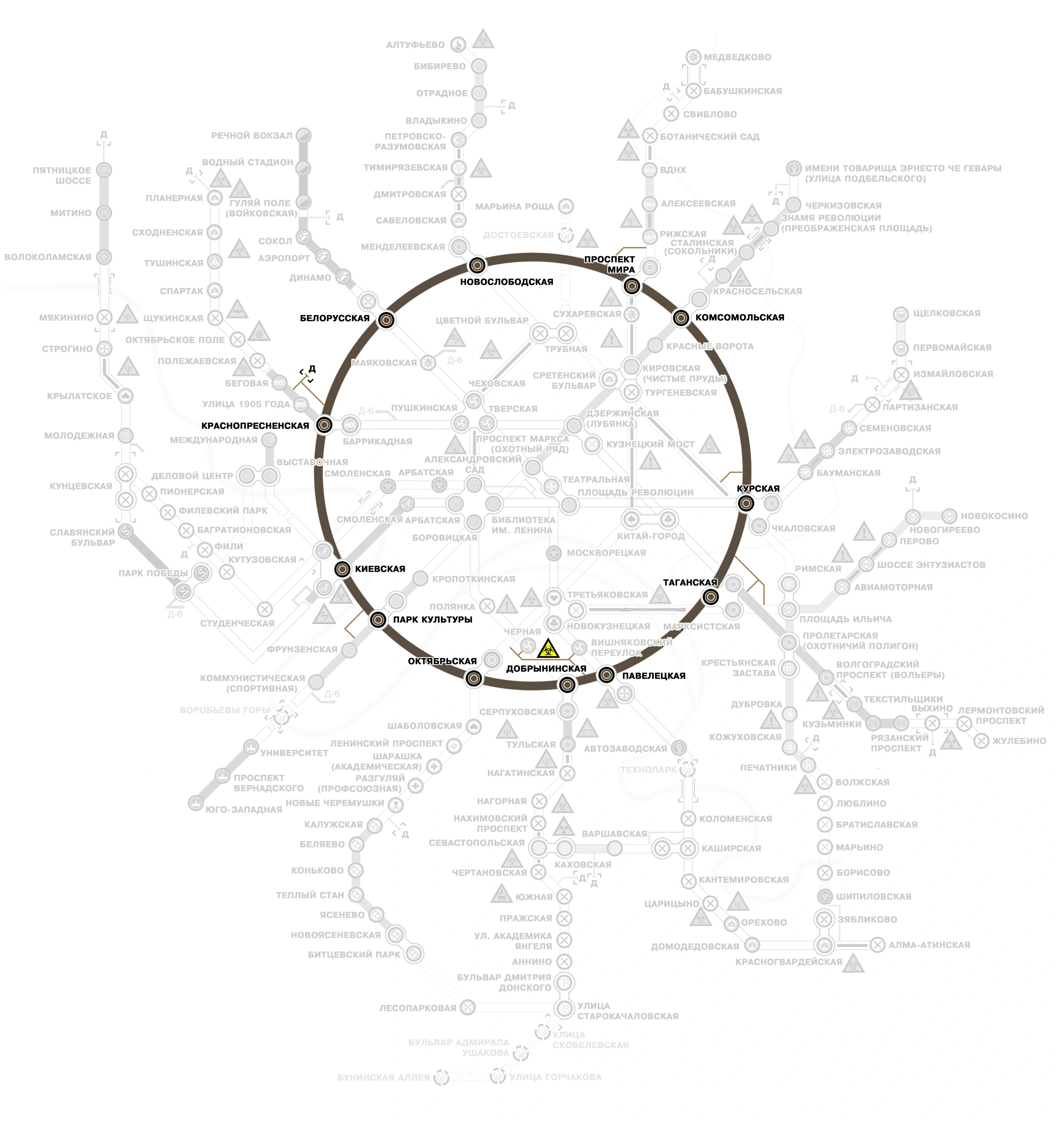 Кольцевая — очень стратегическое место для купцов, потому что с неё возможен переход практически на любую другую линию московского метро. Любой, кто хочет пройти от одного из радиальных участков метро до центрального, также должен пройти через Кольцевую линию. Это не всегда легко, так как некоторые (если не большинство) станций Ганзы имеют «пограничный контроль», когда граждане метро должны подтвердить свою личность с действительным паспортом. Эта практика была создана для ограничения контрабанды и предотвращения проникновения бандитов и других нежелательных гостей.