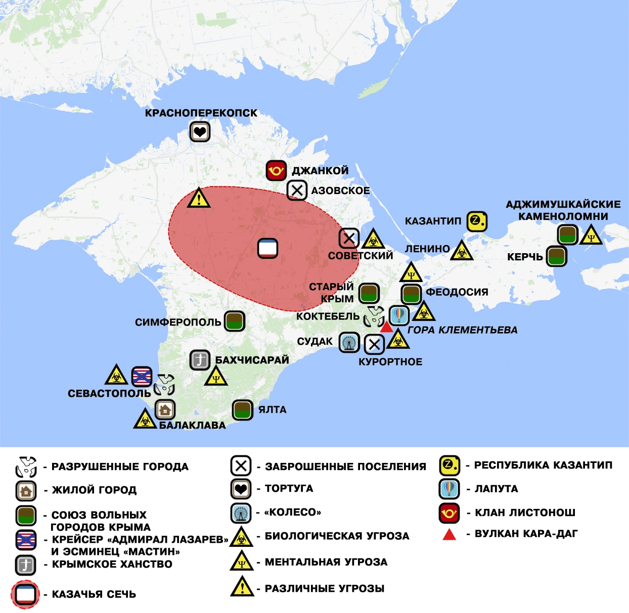 Крейсер «Адмирал Лазарев» и эсминец «Мастин» — совместная община военнослужащих Черноморского ВМФ и ВМС НАТО. Встали на прикол в Южной бухте Севастополя. Как и в Джанкое, здесь люди приспособились к жизни с повышенным радиационным фоном и стали целью агрессии мутофобных сообществ Крыма.