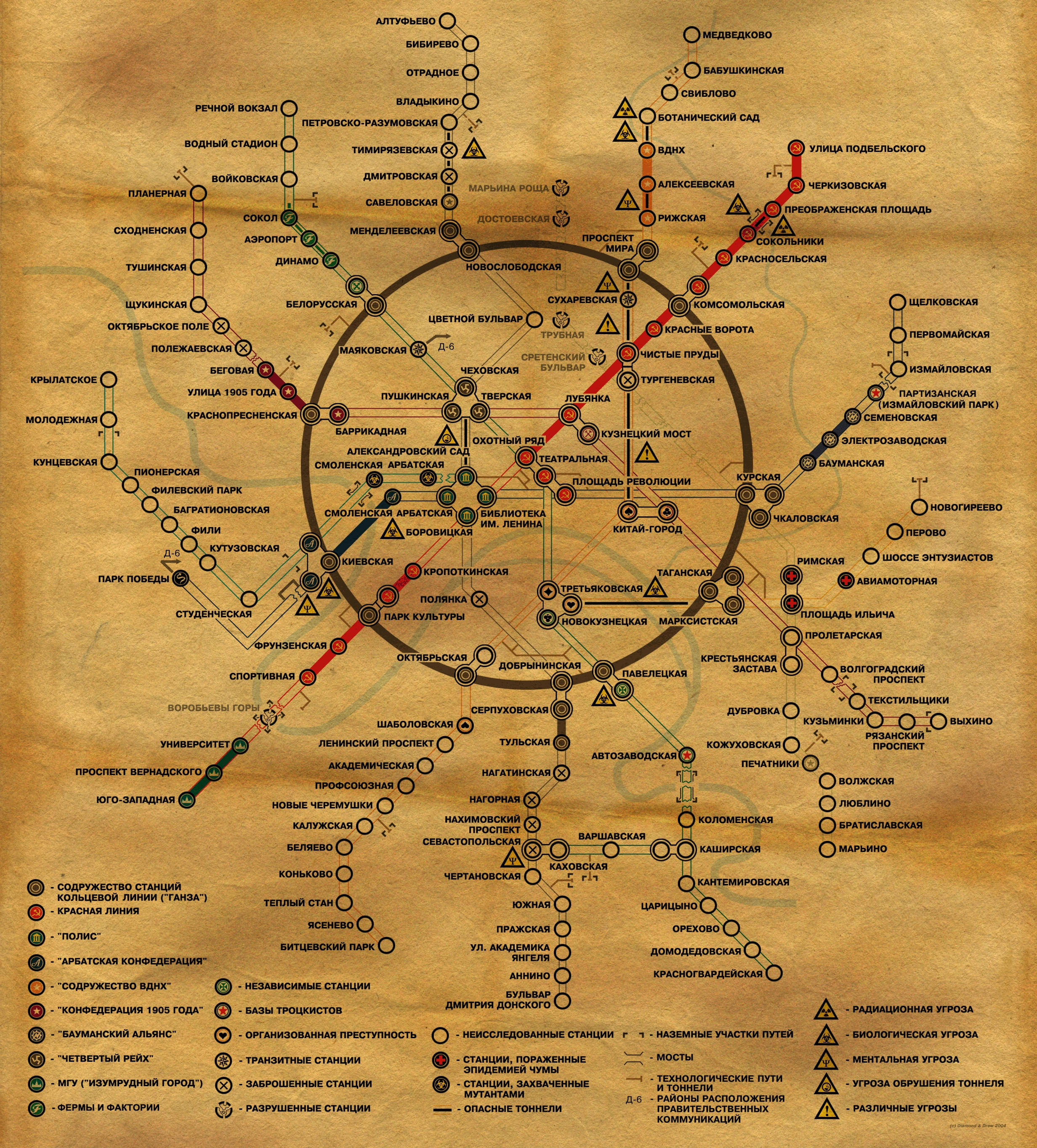 - Червепоклонники — племя людей, живущих на заброшенной и отрезанной от метро станции Парк Победы. Деградировали, практикуют каннибализм. Поклоняются Великому червю, культ которого создан жрецом. Враждебны к технологиям и «людям машин». Используют плевательные трубки с отравленными иглами. Похищают детей с соседних станций для перевоспитания. Имеют странную внешность (обритые головы, рисунок змеи на лбу). Некоторые особи (Вартан) обладают гипнотическими способностями.