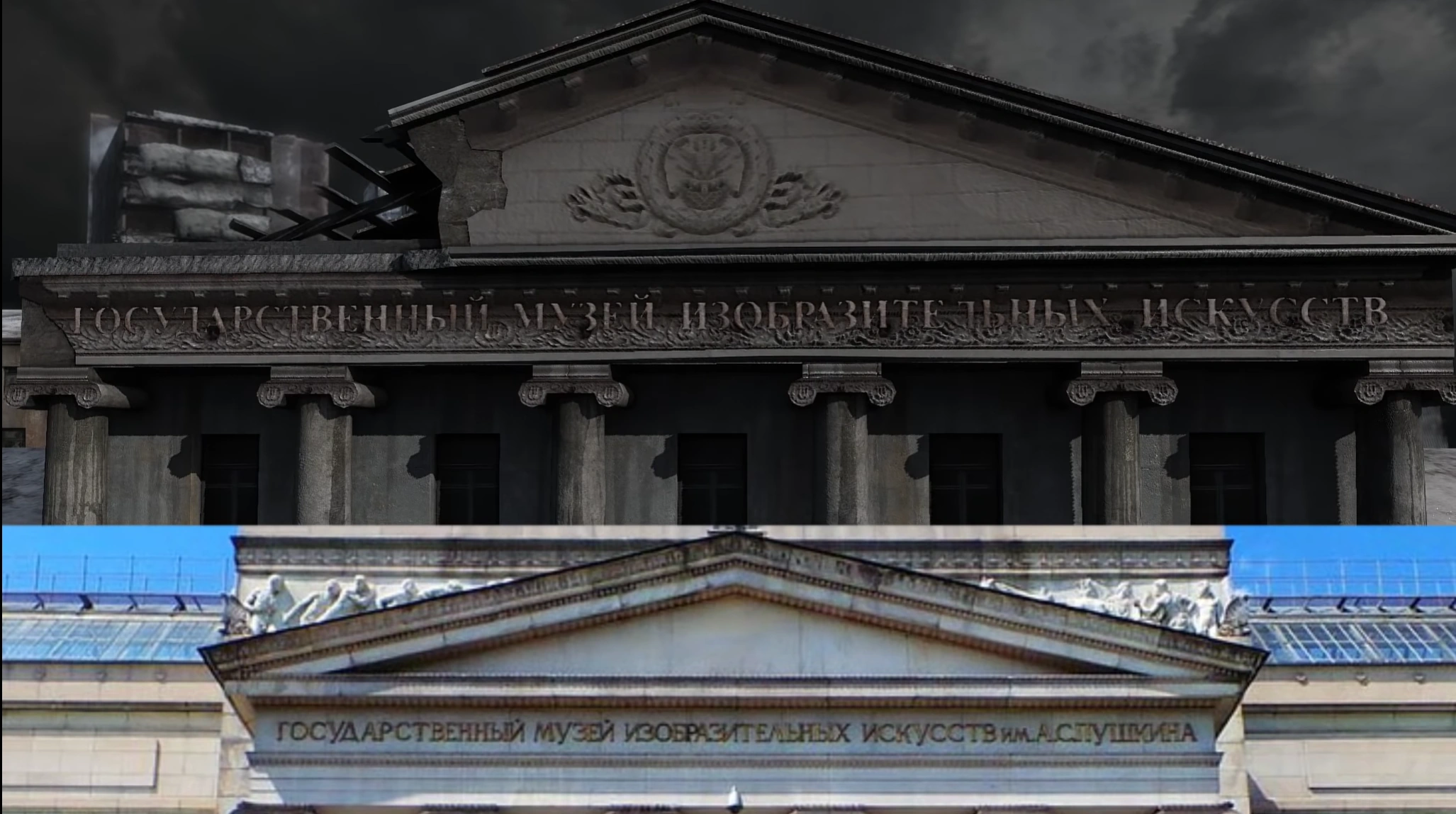 На сооружение с колоннами слева от вестибюля нанесена табличка "Государственный музей изобразительных искусств", взятая, как и фасад, с реального музея изобразительных искусств имени Пушкина , находящегося у станции Кропоткинская . Примечательно, что на предыдущем уровне эта надпись отсутствует.
