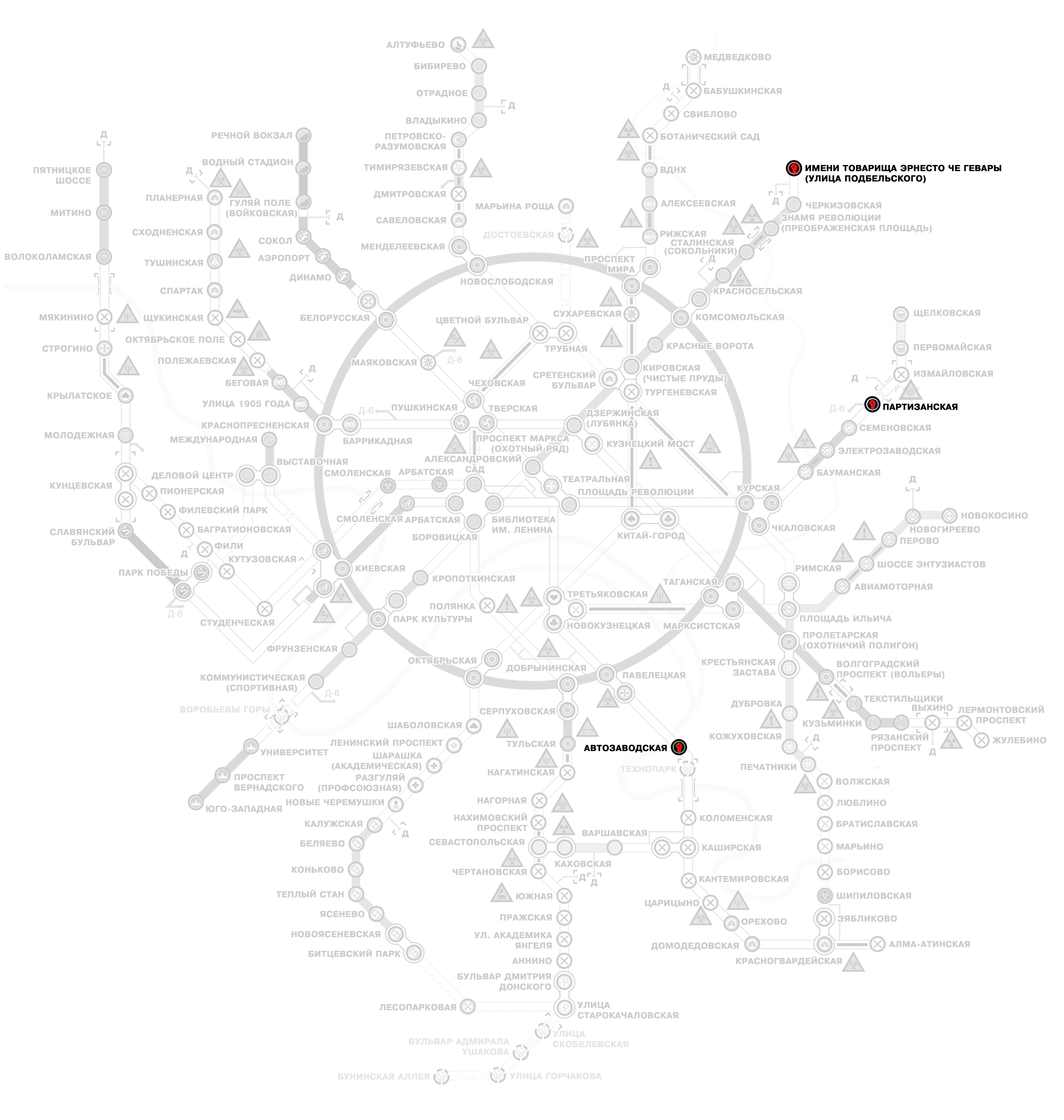 Обозначения известных баз Бригады на карте метро