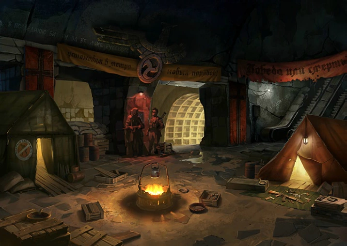 Нижняя часть стен окрашена в зелёный цвет. В дальнем конце зала находится эскалатор, ведущий на «Чеховскую» и в караулку концлагеря. Станция обычно служит площадкой для проведения митингов. Там же стоит трибуна, с которой часто выступает фюрер. Жилой сектор выстроен на одной из платформ, часть арок забетонирована.[29]