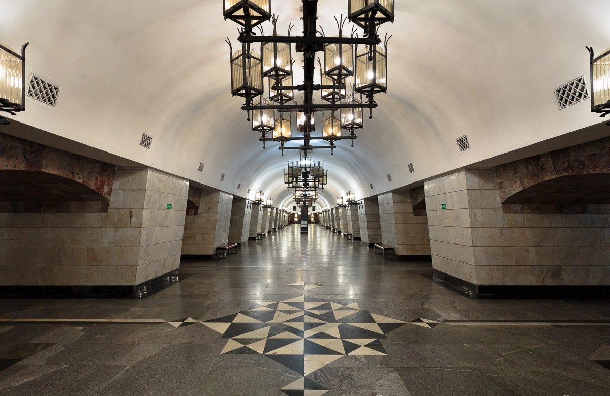 На перроне пилоны стоят на литых чугунных плитах. Внутри пилонов (совершенно уникально) были оставлены естественные скальные породы. Пол платформы выполнен из серого полированного гранита, путевые стены станции выложены мрамором Нижне-Тагильского месторождения, пилоны — мрамором коелгинского месторождения, арки и другие элементы перрона украшены плитами змеевика, арочные обрамления, ниши сделаны из металла. Объёмные декоративные люстры из кованого металла, изготовленные на Уральском электромеханическом заводе, подвешены к своду.